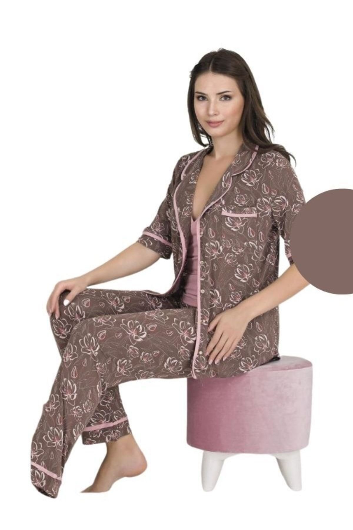 Çiçek desenleriyle süslenmiş bu pijama takımı, hem şık hem de rahat bir uyku deneyimi sunar.; Büyük beden seçeneğiyle her bedene uygun konfor sağlar ve tüm yaş gruplarına hitap eder.; Kısa kollu tasarımı ile serin gecelerde ideal konfor sunarken, belirlenmemiş kalıbıyla vücut hatlarınıza uyum sağlayarak rahat bir kullanım imkanı tanır.; Düz renk paletiyle sade ama şık bir görünüm sergilerken, desenli detaylarıyla göz alıcı bir stil ortaya koyar.; Kumaş tipinin belirtilmemesi, pijama takımının farklı malzemelerden yapılmış olabileceğini gösterir ve böylece her mevsim için uygunluk sunar.;