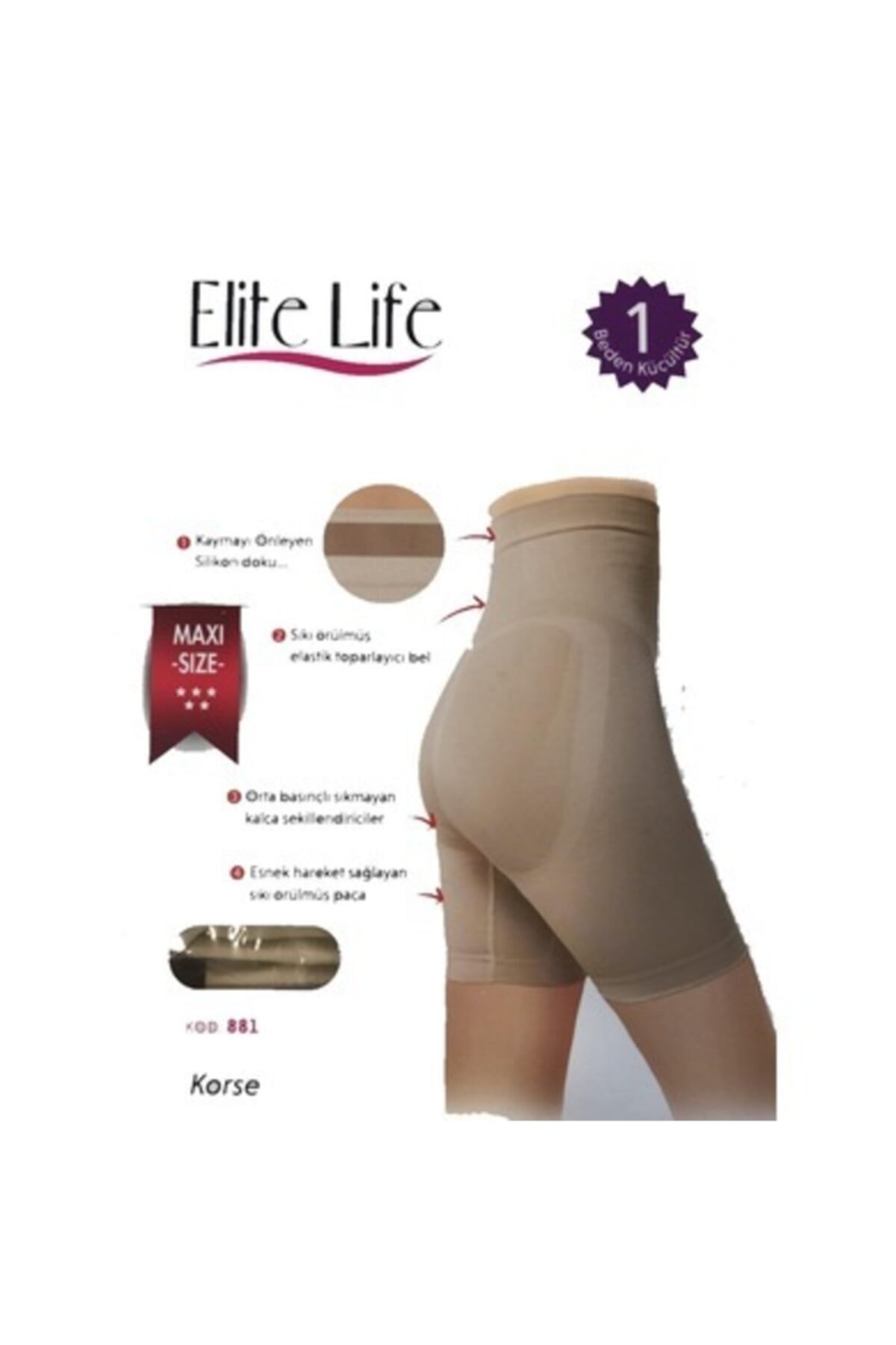 Elite Life 881 Kadın Dikişsiz SİLİKONLU Korse Dikişsiz olarak tasarlanan ürün, korse özelliği ile karın,basen ve baldır bölgelerindeki takviyeli örgüler sayesinden vücudunuzu şekillendirerek 1 beden küçültür. Alt kısmındaki agraf sayesinde kullanım kolaylığı sağlarken, ön ve yan yüzeylerde kullanılan özel örgüler sayesinde toparlayıcı işlevi görür. Bel kısmındaki silikon bant, ürünün vücudunuza tutunmasını sağlayarak kaymasını engeller. Nefes alabilen kumaş yapısı sağlığınızı korur. Bakımı kolaydır; çabuk kurur ve ütü gerektirmez. Yıkama Talimatına Uygun Yıkayınız Bir beden küçültme özelliğini göze alarak sipariş vermenizi öneririz