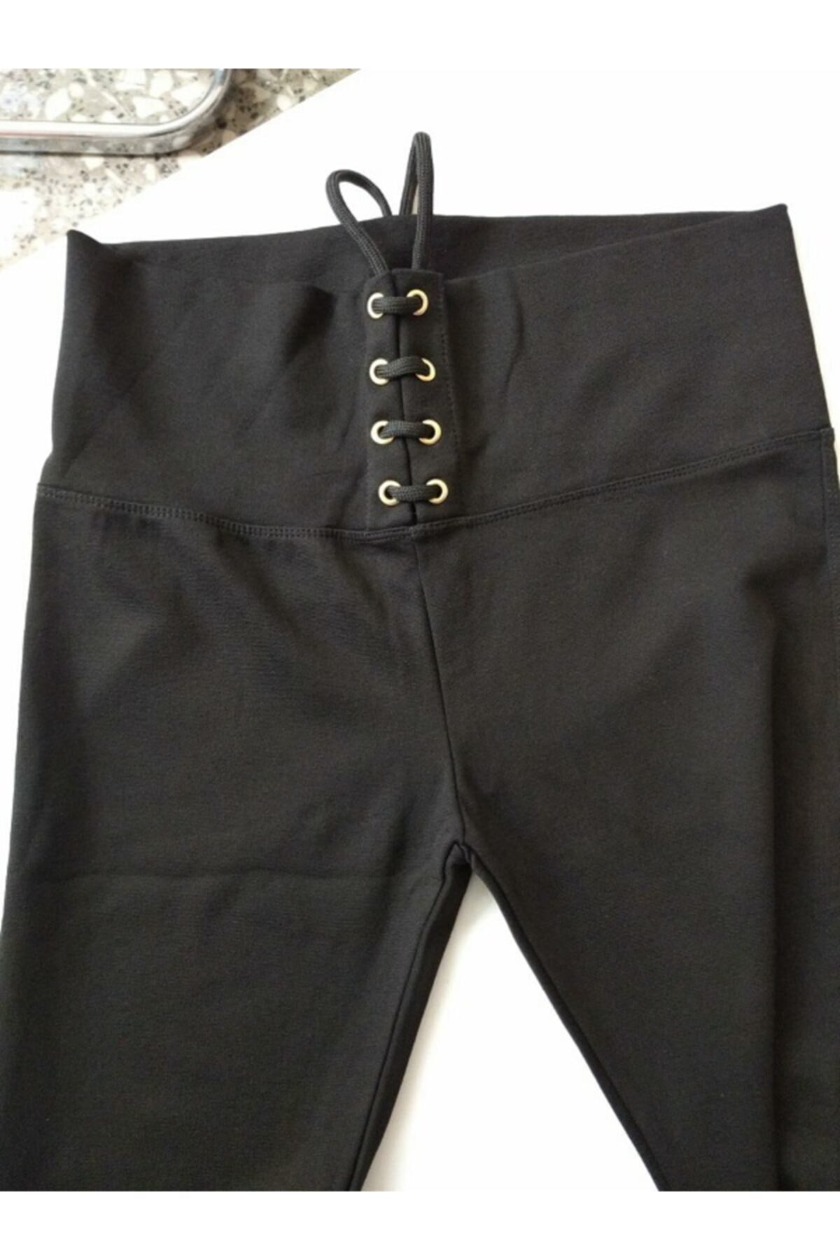 önü bağcıklı siyah ekstra yüksek bel kadın tayt çelik örmedir likralıdır